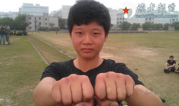 冬练三九,夏练三伏,郭娅君这对铁拳早是伤痕累累郭娅君,1990年8月出生于广东揭阳,2006年第一次接触跆拳道便深深地喜欢上这项运动,一路参加考试“过关斩将”,4年后顺利晋级“黑带”。2011年6月大学毕业后在一所小学当体育老师,课余在武道馆教练跆拳道,收入颇丰。但是,从军报国的理想一直在小郭的脑海中深深扎根,挥之不去。2011年底,驻香港部队首次大规模征召女兵,郭娅君辞去稳定的工作,实现了自己的军营梦想,拥有“黑带”的她也成为新兵中的名人。